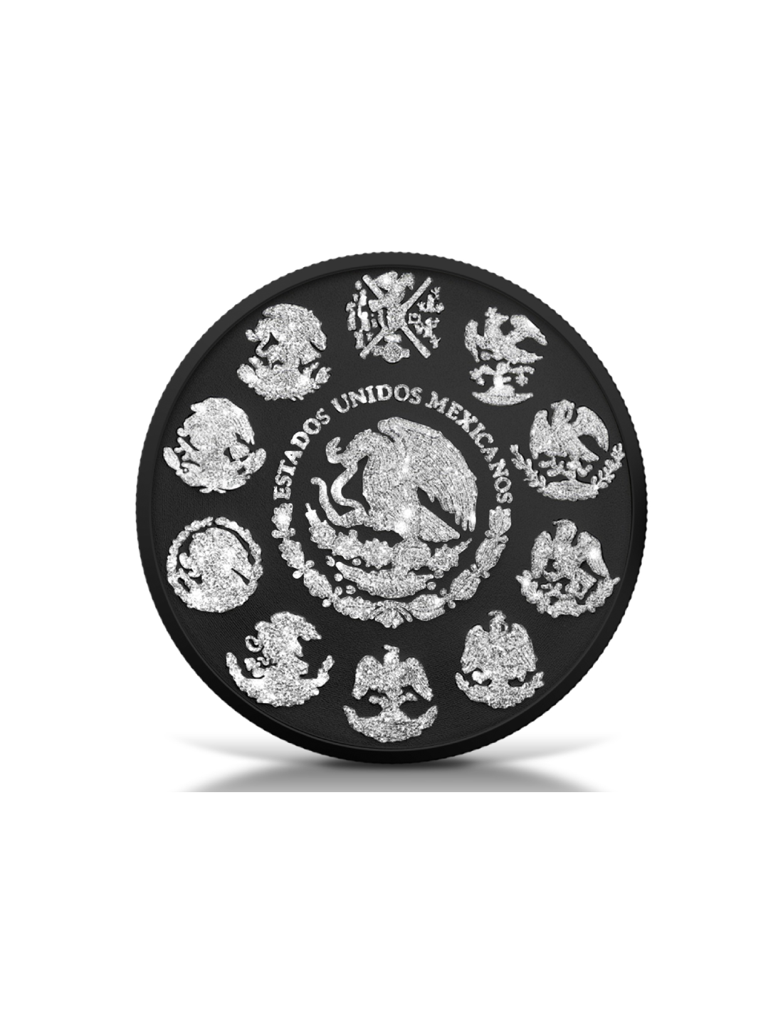 Diese schöne 1 Oz Silbermünze zeigt eine schöne schwarze Platin plattiert Libertad mit Diamantstaub. Es wird in seinem Fall, zusammen mit seinem Echtheitszertifikat Schiff sein.