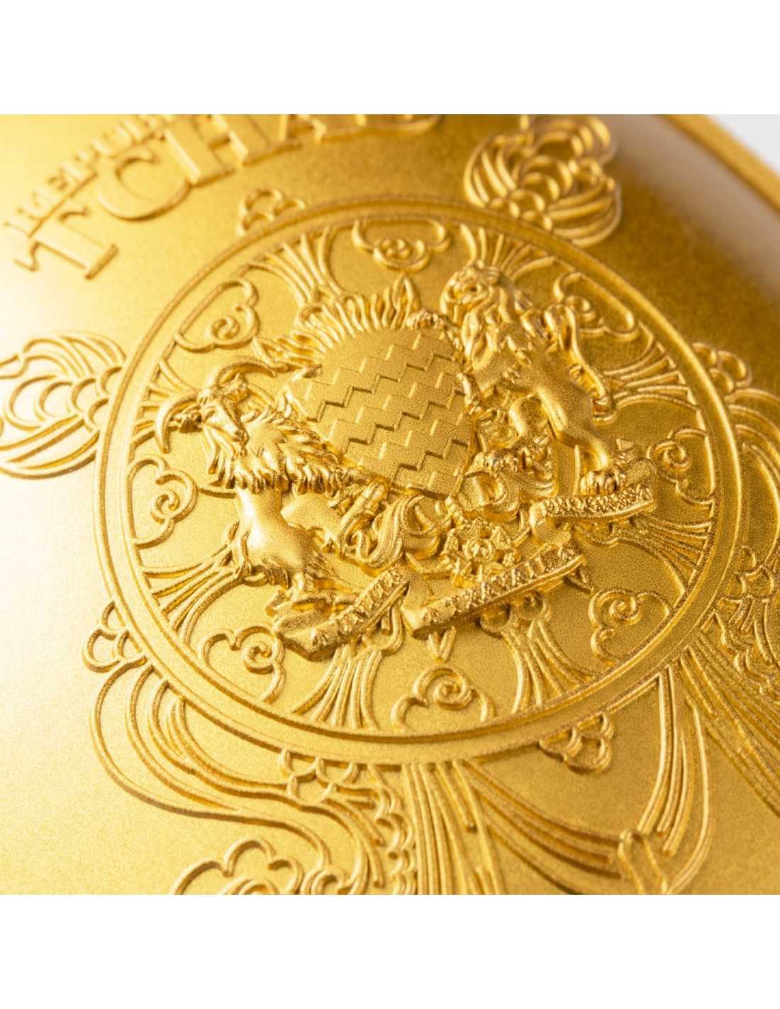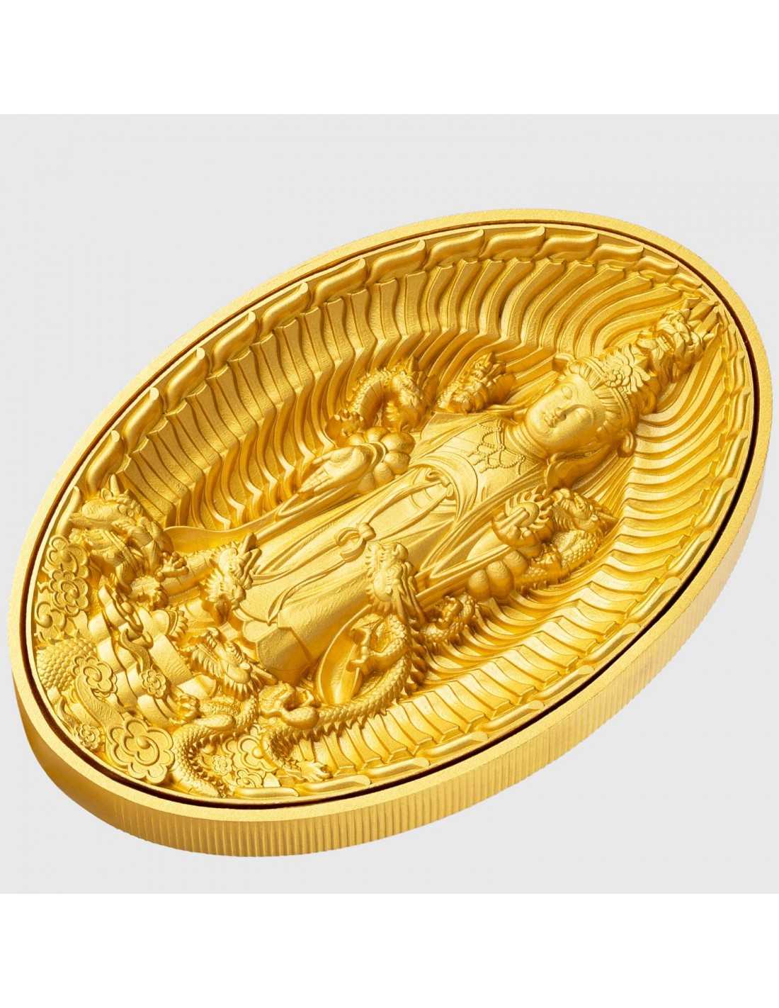 This interesting 1 Oz Silver & 6 Oz Copper coin is dedicated to the Eight Dragon Buddha; this image is associated with the Mahayana Buddhist tradition and is often found in temples and other religious sites. The coin has an Antique Finish quality, is gilded in Gold and has a peculiar shape. The coin comes in a box, along with its Certificate of Authenticity.