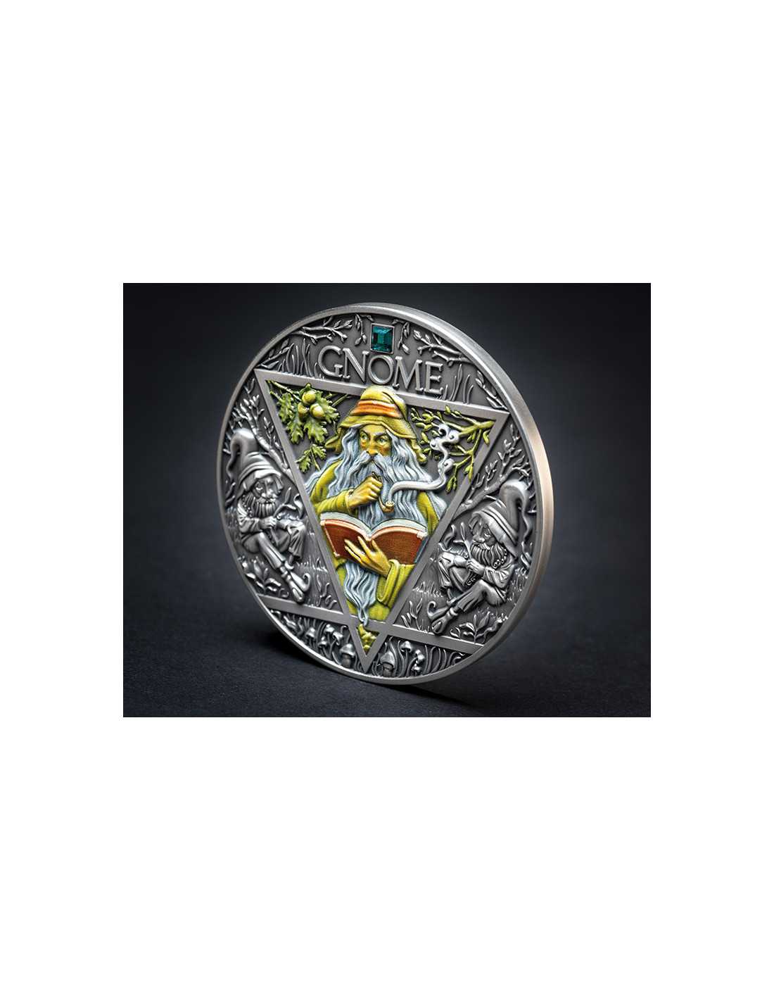 This new 2 Oz Silver coin is part of the “Four Elementals” series and is dedicated to the Gnome, a magical creature, symbol of the Earth. The coin has an Antique Finish quality, wonderful Reliefs and beautiful coloration with a green crystal insert. It comes in a case, along with its Certificate of Authenticity.