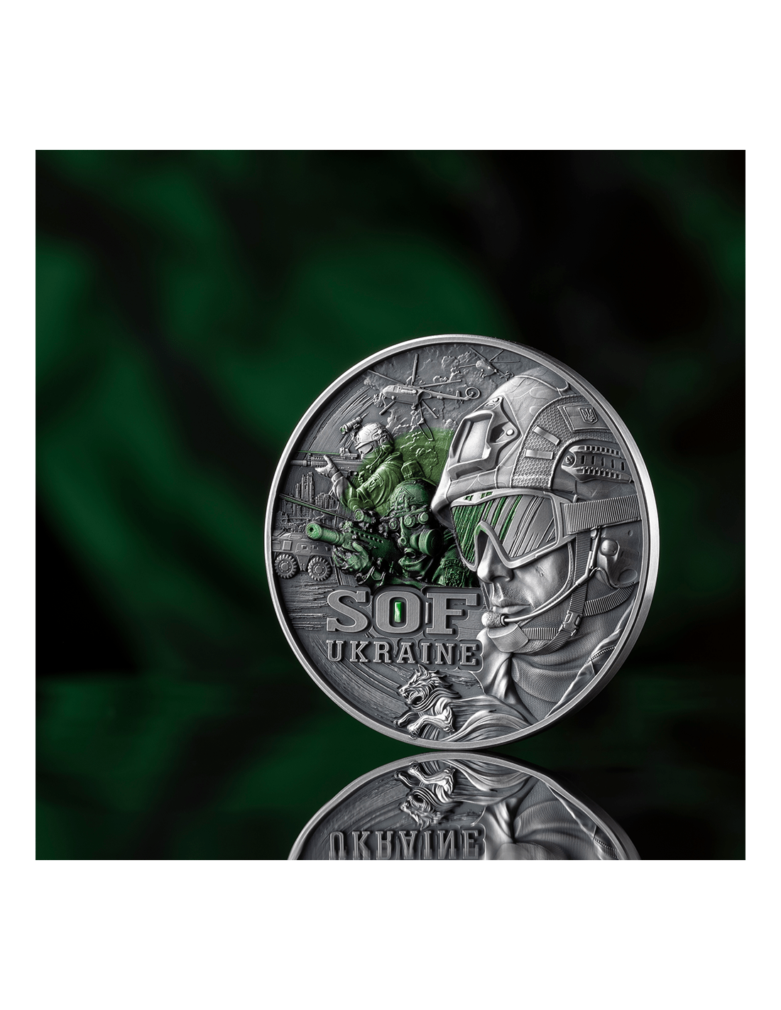 This beautiful 2 Oz Silver coin is the new coin of the "Guardians of Freedom" series. In this edition : the special operations forces. The coin has an Antique Finish quality with partial coloration, glow in the dark, has an High Relief and comes in a special case, along with its Certificate of Authenticity.