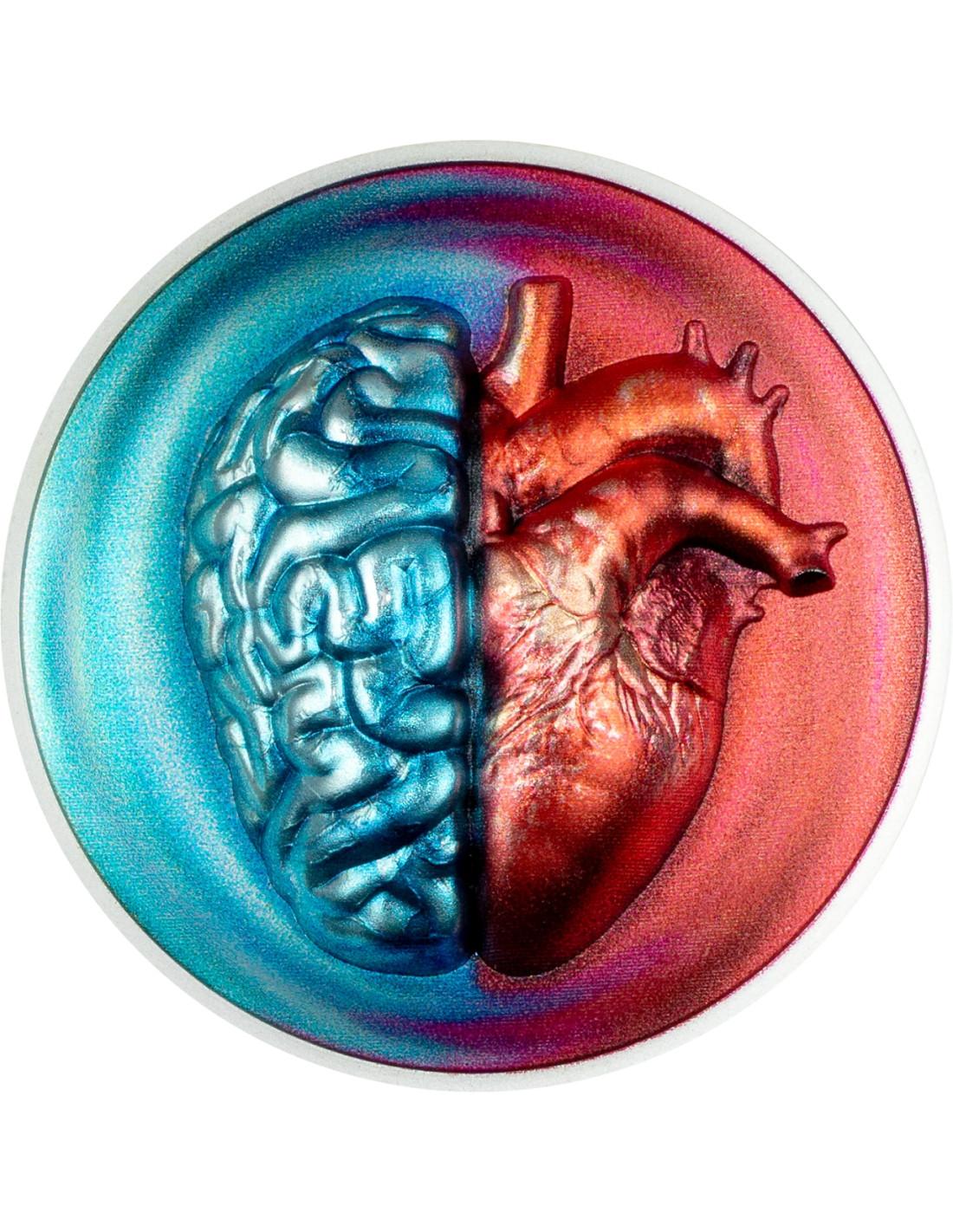 This remarkable 2 Oz Silver coin illustrates the timeless struggle between logic and feelings, highlighting the delicate harmony between rational thought and emotional impulse. Entitled Head vs Heart, it presents a striking sculptural design enhanced by bold color contrasts and an expressive concave shape. Struck in pure Silver with Proof quality, this unique creation offers strong visual depth and symbolic meaning. The coin is presented in its case and comes with its Certificate of Authenticity.
