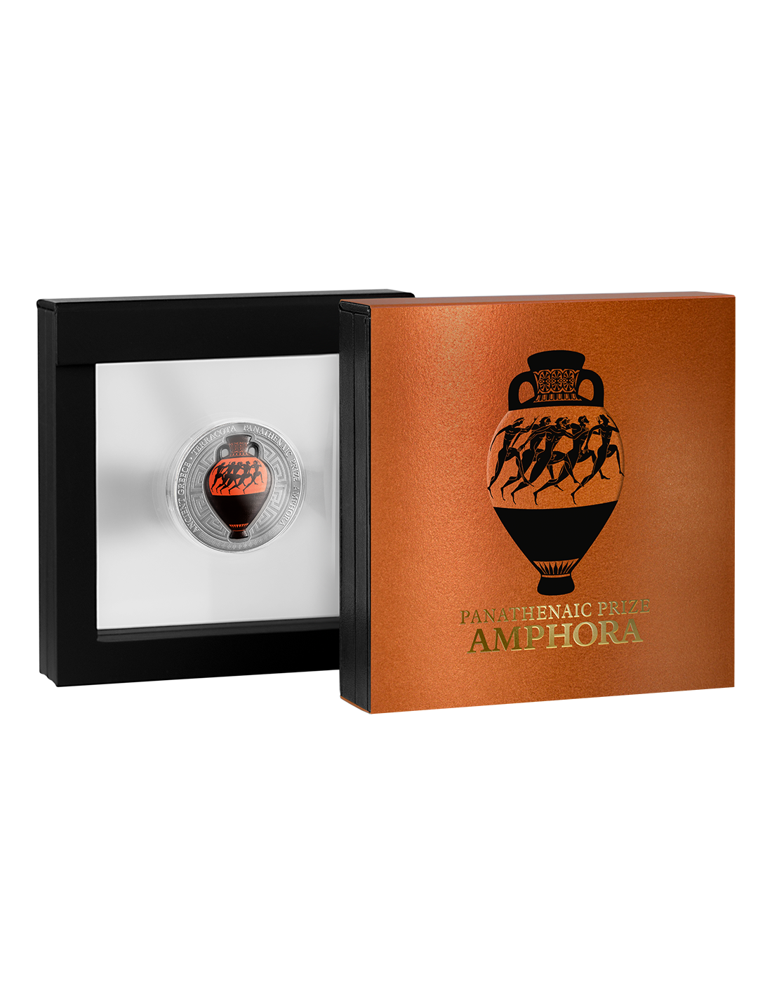 This beautiful 2 Oz Silver coin celebrates the culture of ancient Greek through the depiction of an ancient amphora. The coin has Antique Finish quality, features a Ceramic insert and digital printing and comes in a display case, along with its Certificate of Authenticity.
