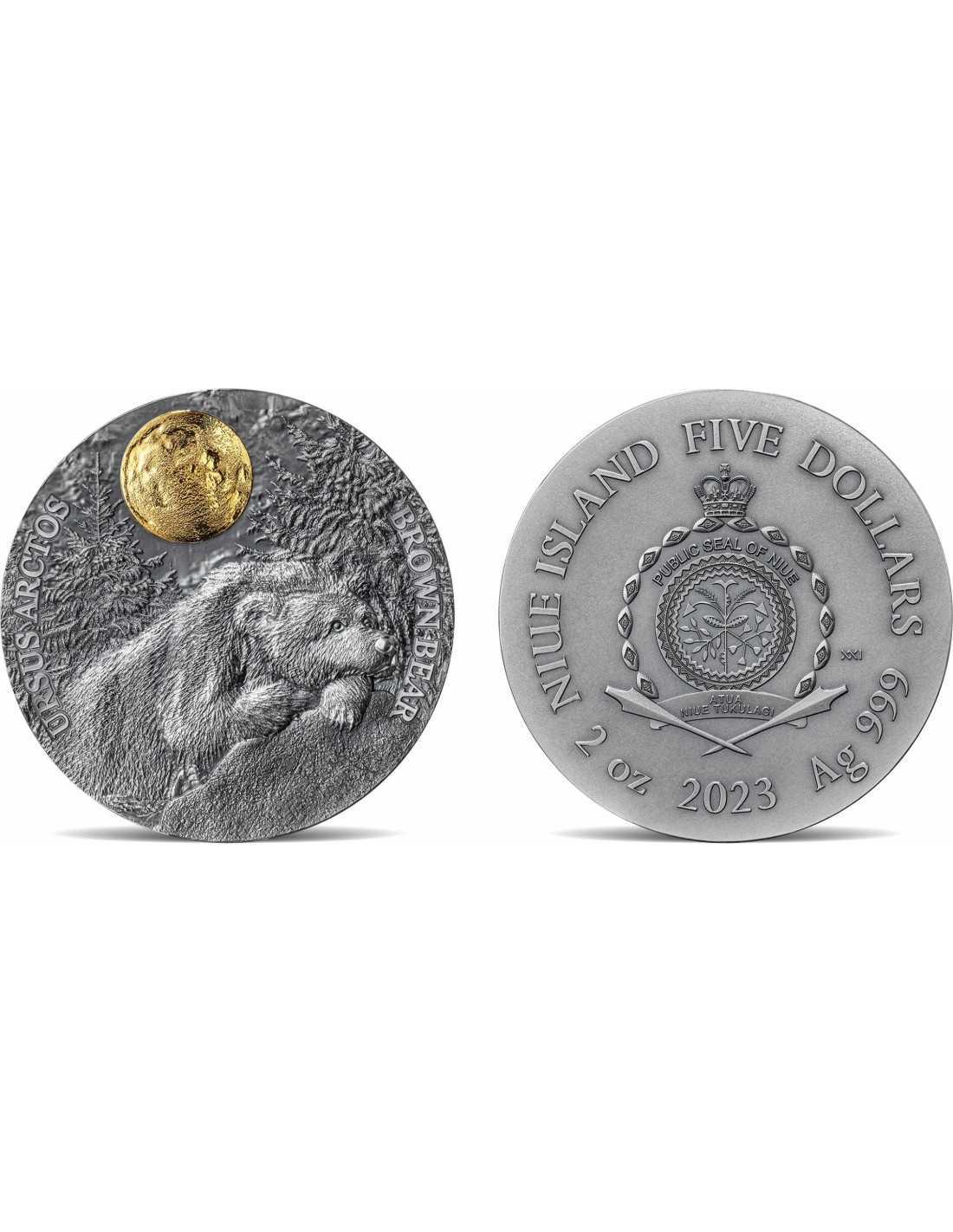 This beautiful 2 Oz Silver coin is part of the "Wildlife in the Moonlight" series and is dedicated to the brown bear. The coin has an extremely detailed High Relief, has Antique Finish quality, features selective Gilding and comes in a themed box, along with its Certificate of Authenticity.