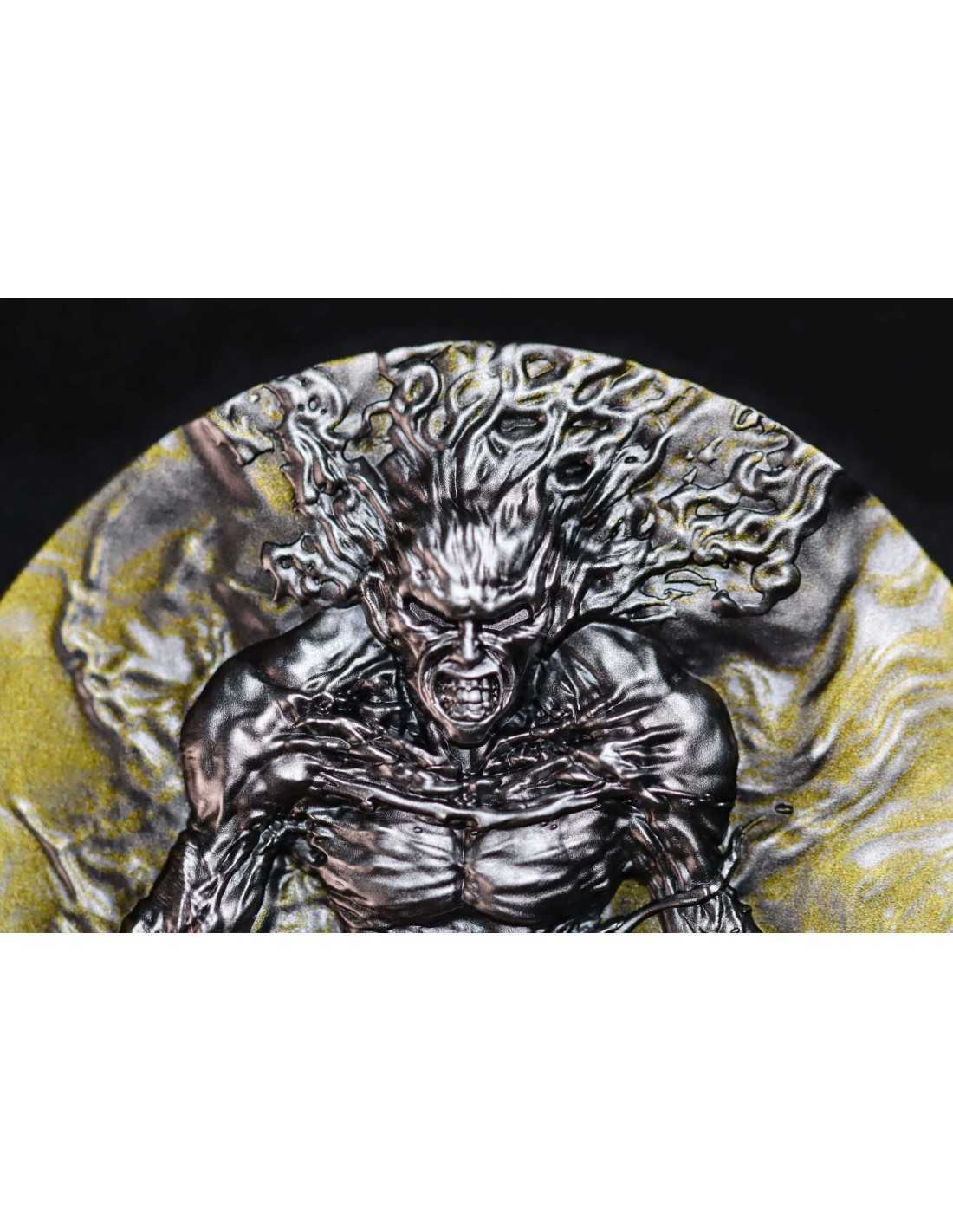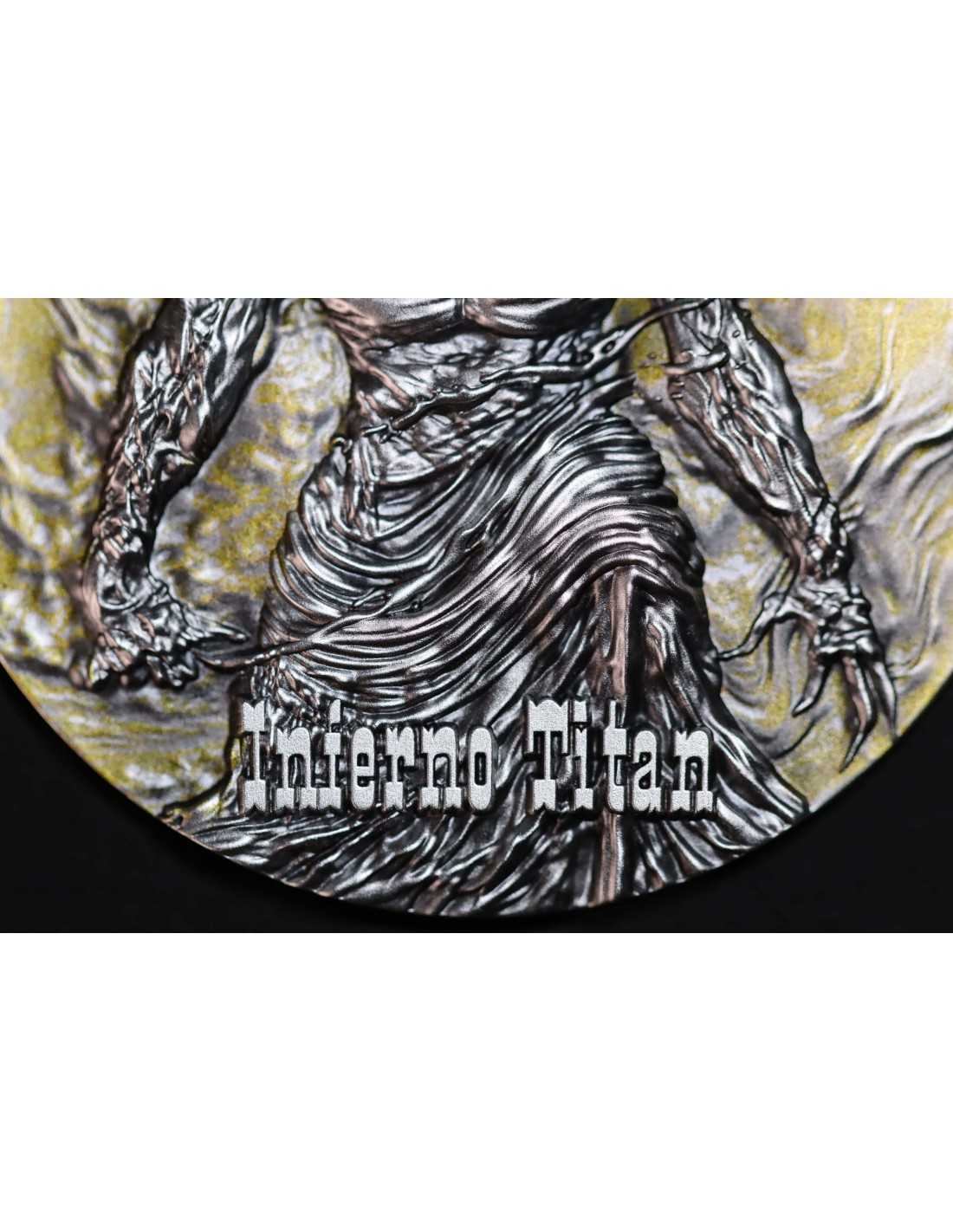 This beautiful 2 Oz Silver coin is dedicated to the fiery power of Inferno Titan, a colossal mythological force. The coin has a beautiful high relief design with Antique Finish and partial gold coloration. It comes in its themed case along with its Certificate Of Authenticity.
