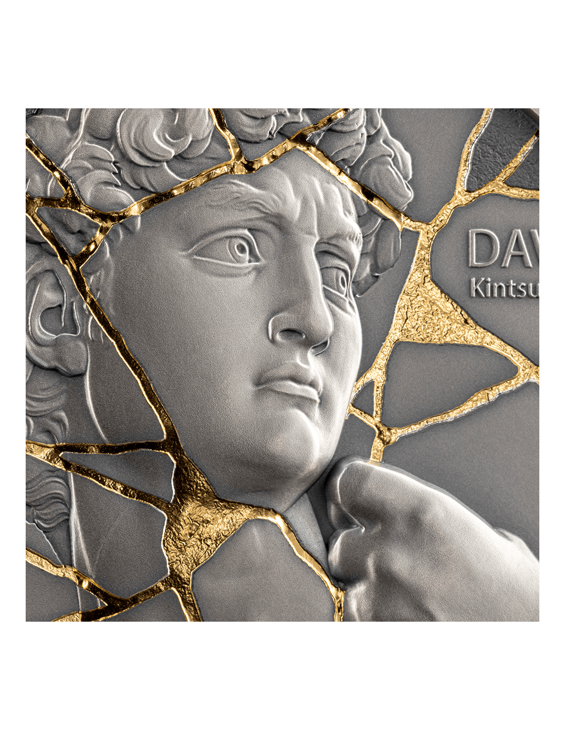 Esta hermosa moneda de plata de 2 oz es la primera emisión de la colección "Kintsugi Art" y está dedicada a David. Esta moneda reimagina la icónica escultura de Miguel Ángel a través de la lente del arte japonés. Tiene calidad de acabado antiguo, presenta un bello altorrelieve y está chapada en oro. Se entrega en un estuche de madera, junto con su Certificado de Autenticidad.