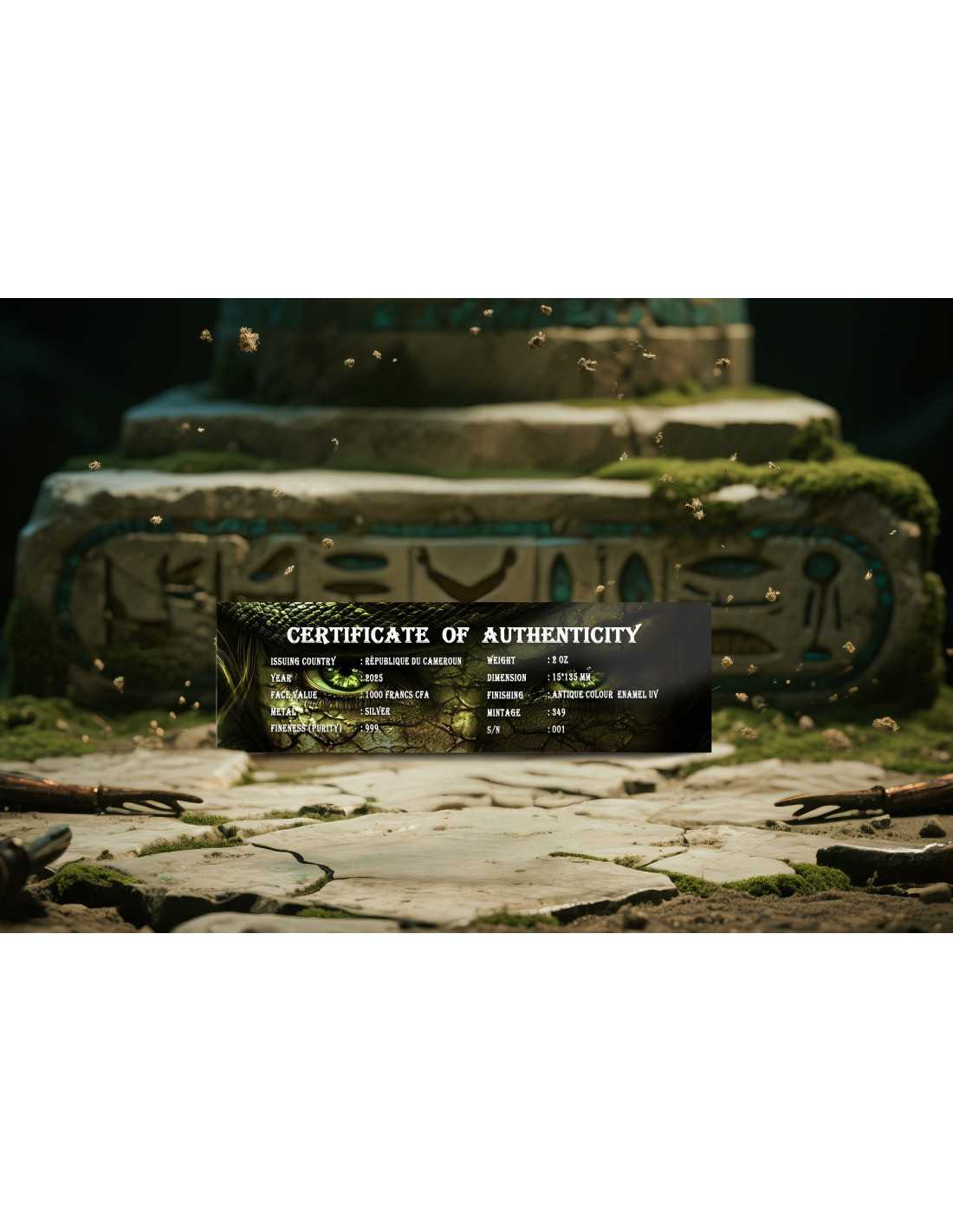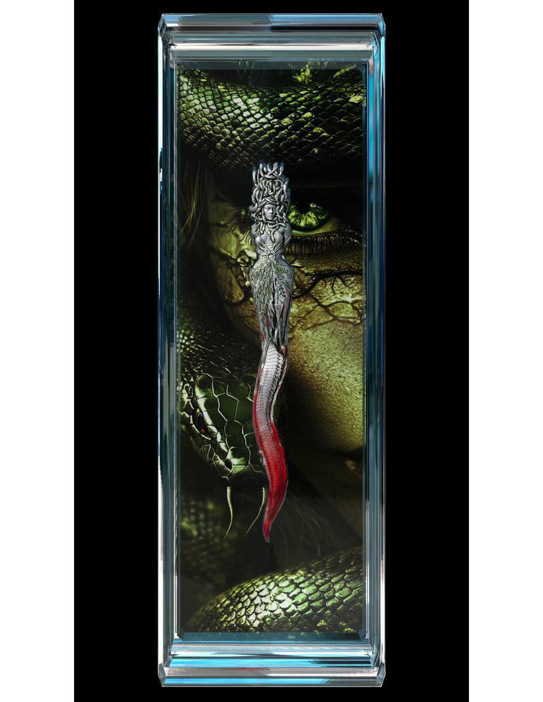 Esta hermosa Plata de 2 Oz es el primer lanzamiento de la nueva serie "Curse and Divin Weapon". En esta edición : la Daga de Medusa, que una vez fue una mujer mortal de rara belleza. Fue maldecida y se hizo conocida por sus serpientes retorcidas como cabello y una sentencia de muerte para una mirada. La moneda tiene un hermoso diseño antiguo en altorrelieve con una coloración muy agradable. Se entrega en un estuche, junto con su Certificado de Autenticidad.