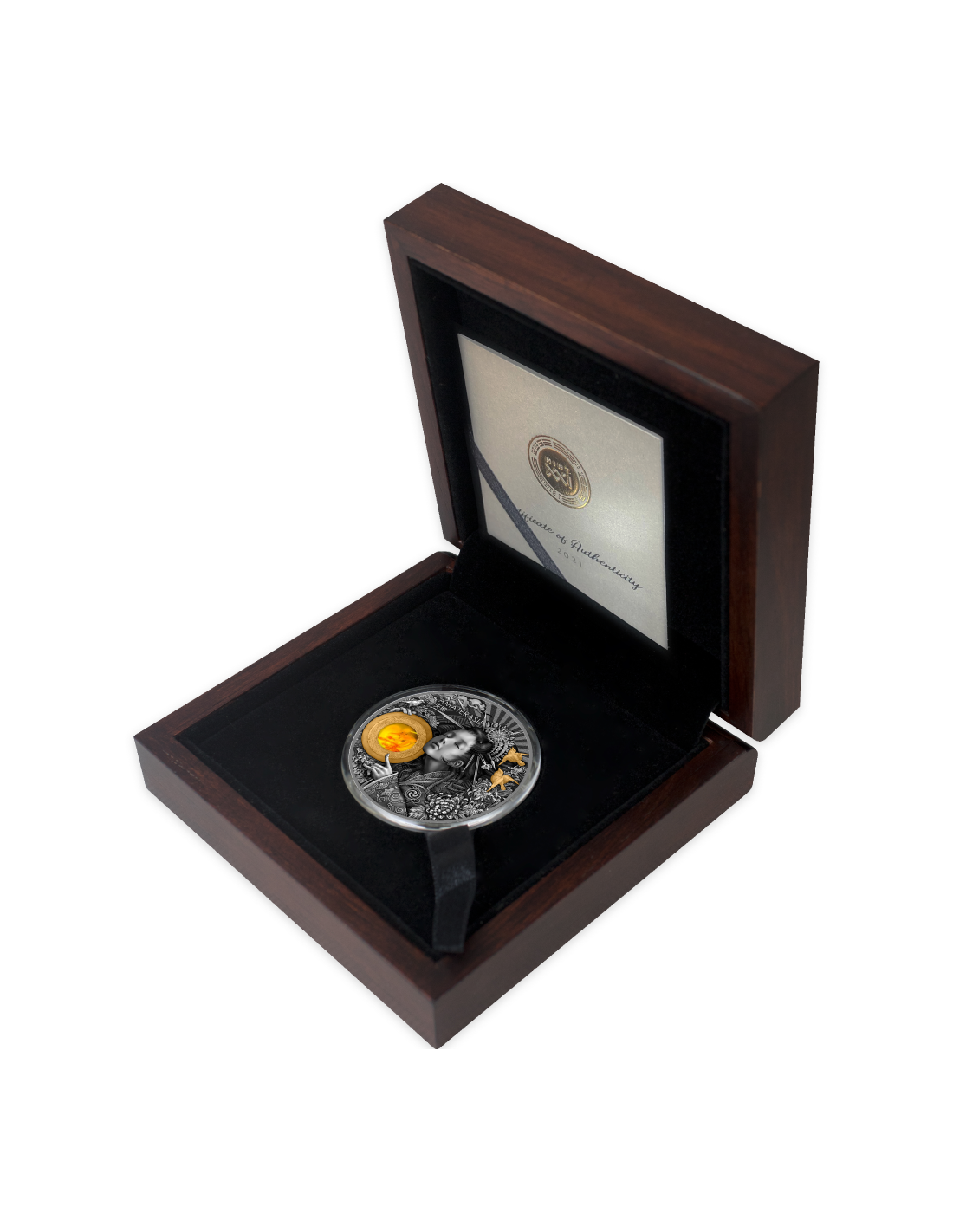 This spectacular 3 Oz Silver coin is the second issue in the “Divine Faces Of The Sun” series and is dedicated to Amaterasu, a celestial sun goddess and an important Shinto deity. The coin has an Amber insert, it’s selective Gilded, has an Antique Finish quality and comes in a case, along with the Certificate of Authenticity. It comes in a case, along with its Certificate of Authenticity.