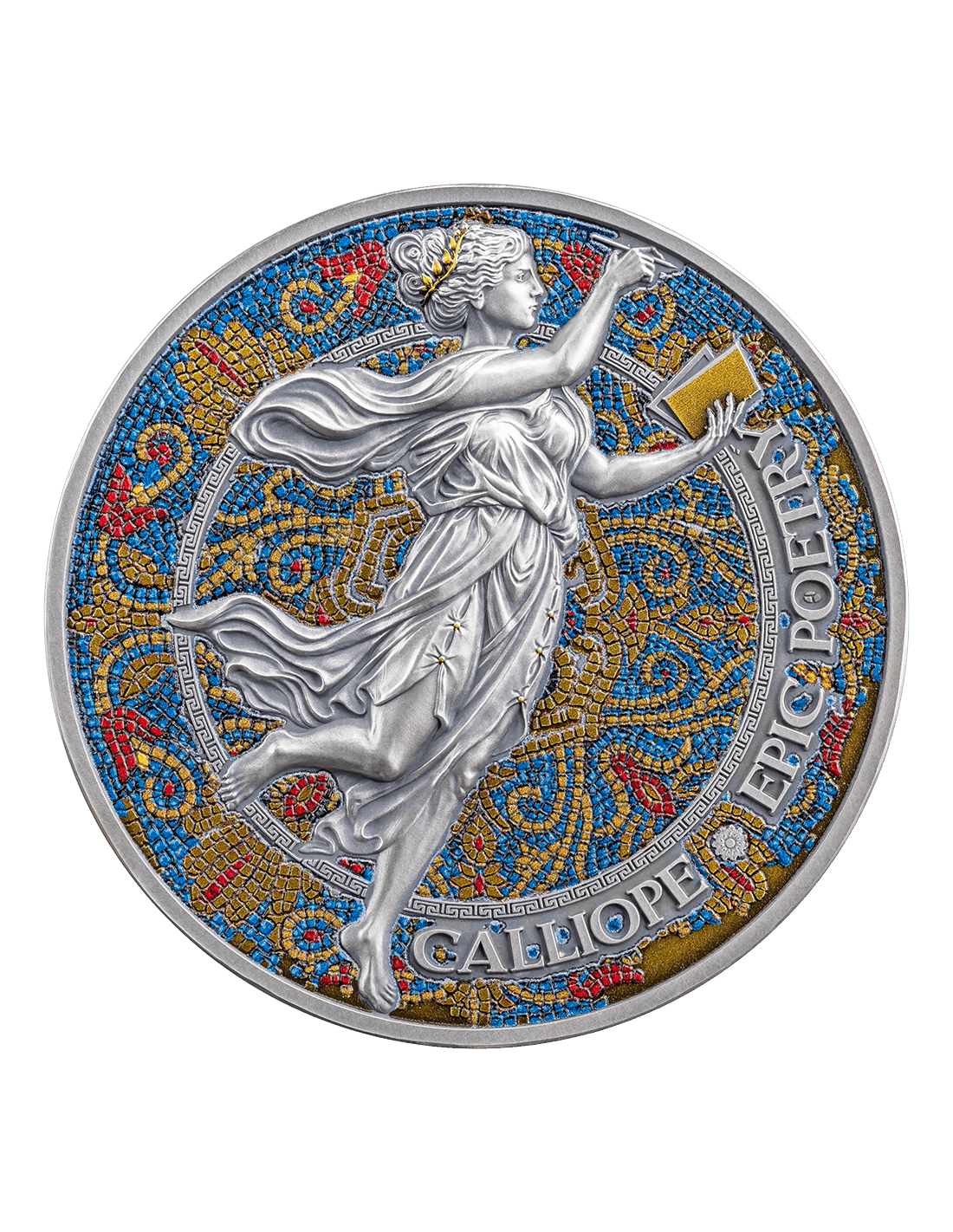 Cette superbe pièce de deux onces en argent est la première de la série "Nine Muses" et est dédiée à Calliope, la plus âgée d'entre elles. Dotée d'un superbe design mosaïque coloré et d'une Finition Antique, cette pièce est livrée dans sa boite, accompagnée de son Certificat d'Authenticité.