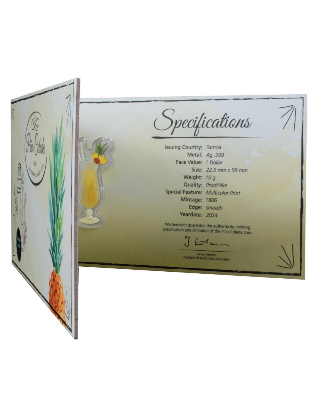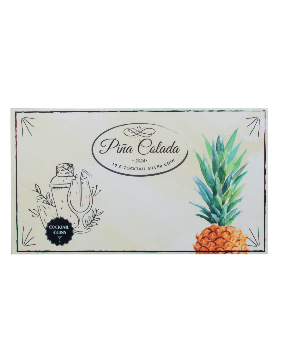Cette très jolie pièce de 10g en argent est dédiée au cocktail dit Piña colada. Dotée d'un très jolie design colorisé en forme de cocktail, elle est livrée dans sa pochette, accompagnée de son Certificat d'Authenticité.