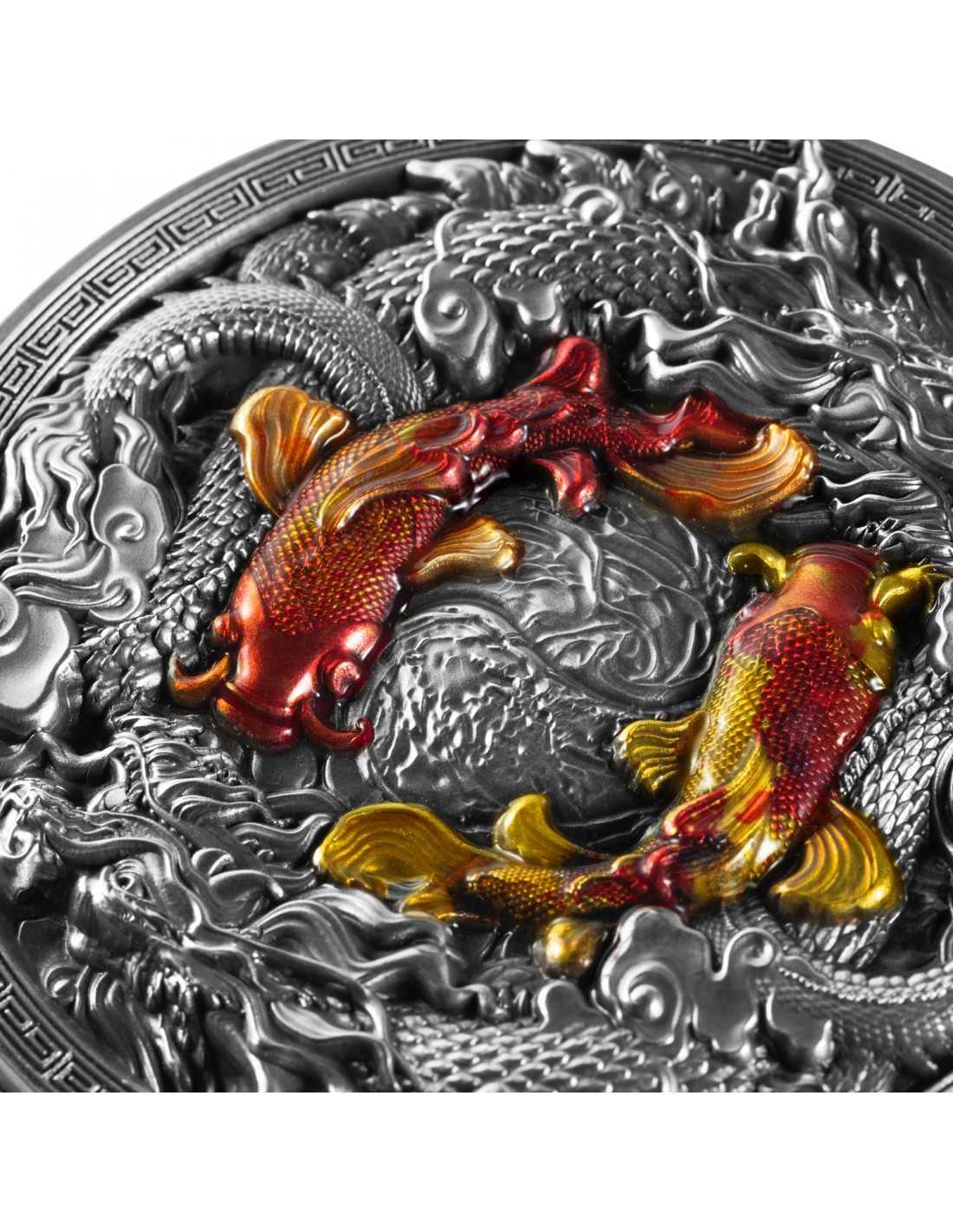 Cette superbe pièce de deux onces en argent et 11.5 onces en cuivre est dédiée aux carpes Koi et aux Dragons, symboles de l'eau et du feu, représentant l'harmonie. Cette pièce bénéficie d'un superbe niveau de détail avec une coloration partielle et est livrée dans sa boite, accompagnée de son Certificat d'Authenticité.