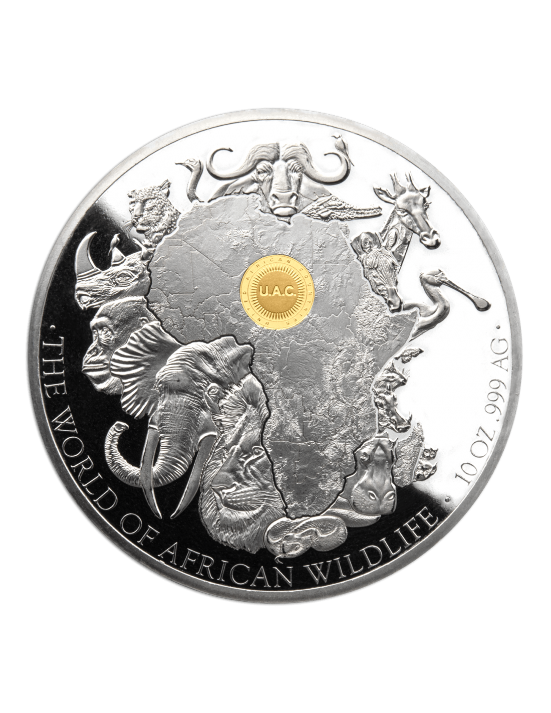 This amazing 10 Oz Silver coin celebrate the diversity of African wildlife and is issued by a union of twelve African countries. The coin has an incredible high relief design with a gold plating and comes in its special case, along with its Certificate of Authenticity.