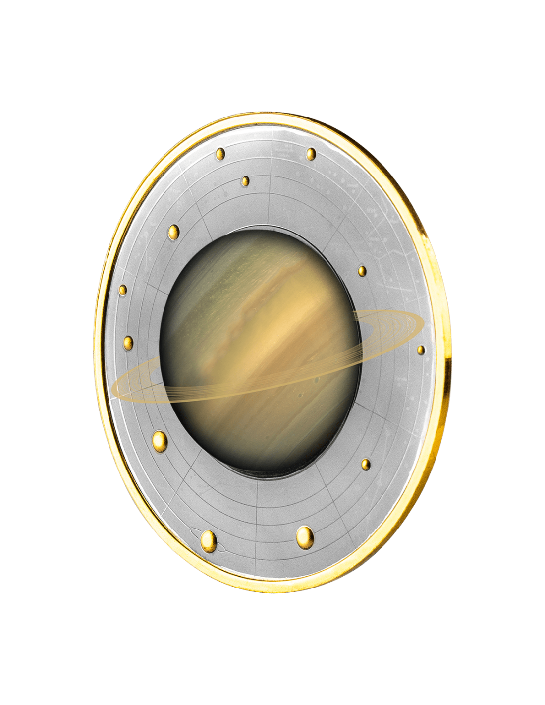 This Silver coin is dedicated to planet Jupiter. The coin has a great design and beautiful coloration with gold plating, has a very nice lens insert and a Proof quality. It comes in a case, along with its Certificate of Authenticity.