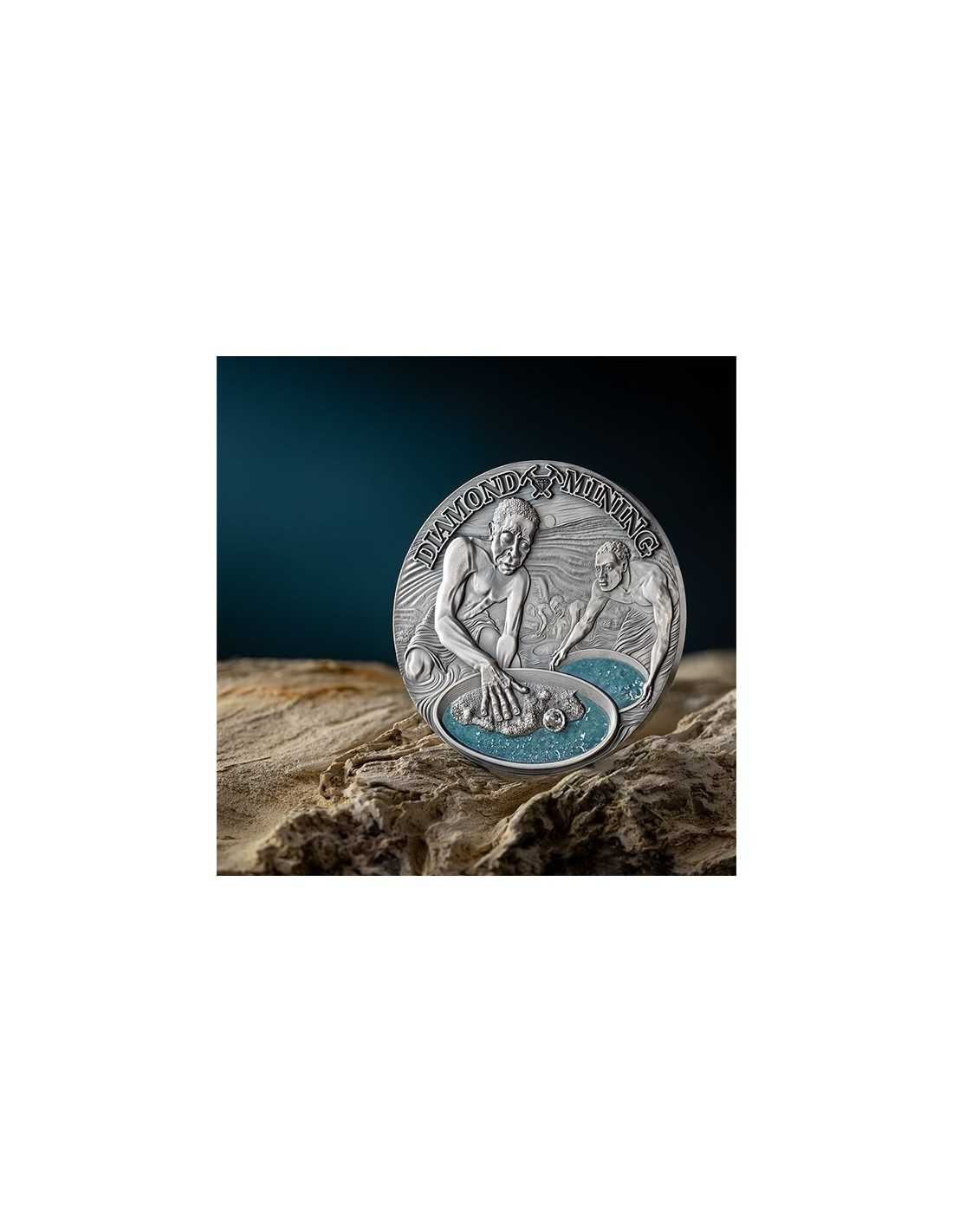 This beautiful 50g Silver coin depicts a group of men patiently sifting water to find diamonds. This high relief coin has a beautiful coloration with UV lacquer, an Antique Finish quality and comes in a case, along with its Certificate of Authenticity.