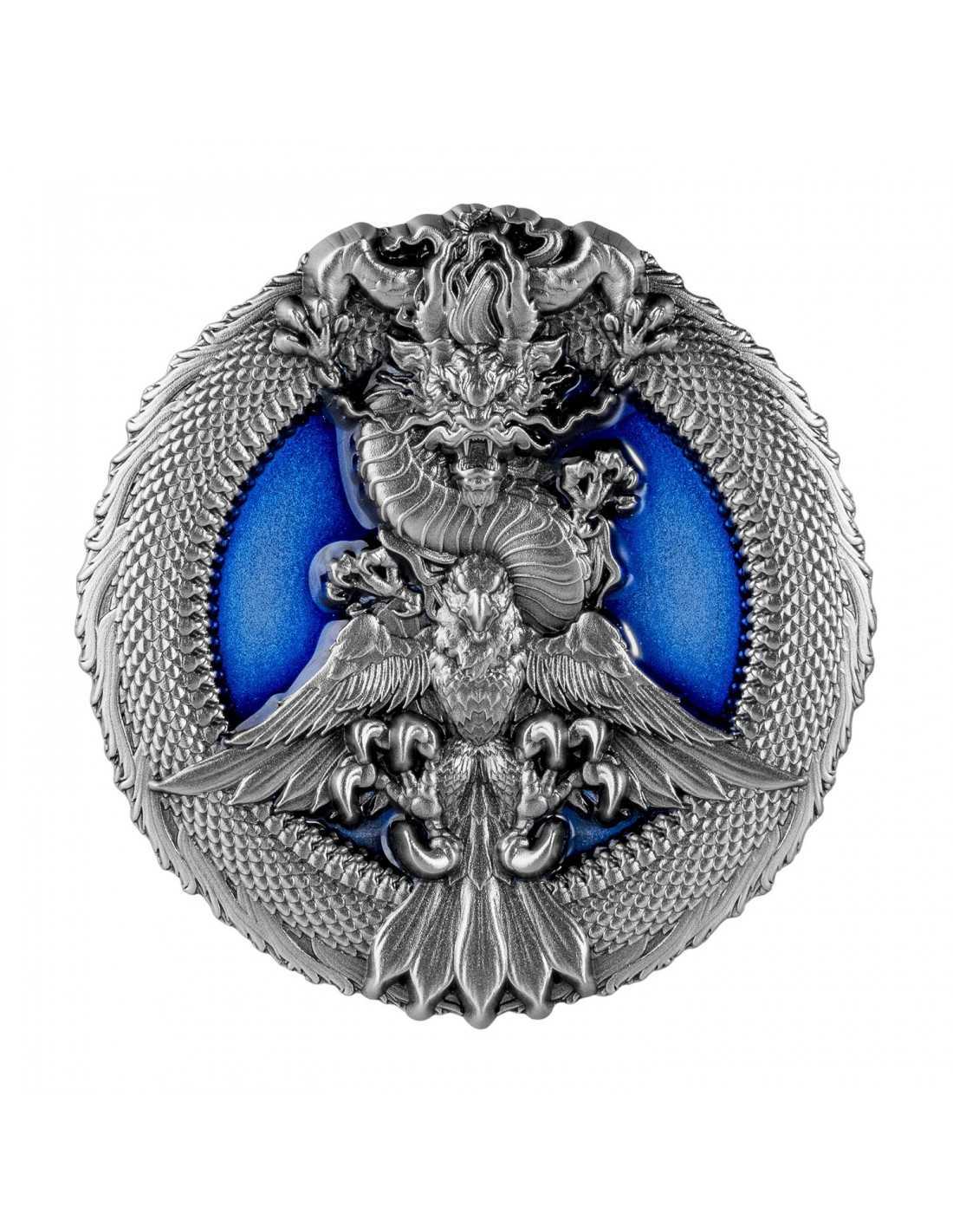 This impressive 3 Oz Silver coin is dedicated to the symbol of Peace and features two beautiful animal symbol of wisdom and peace: the Dragon and the Eagle. The coin has an Antique Finish quality, has an Ultra High Relief and has a beautiful translucent blue enamel. It comes in a beautiful case, along with its Certificate of Authenticity.
