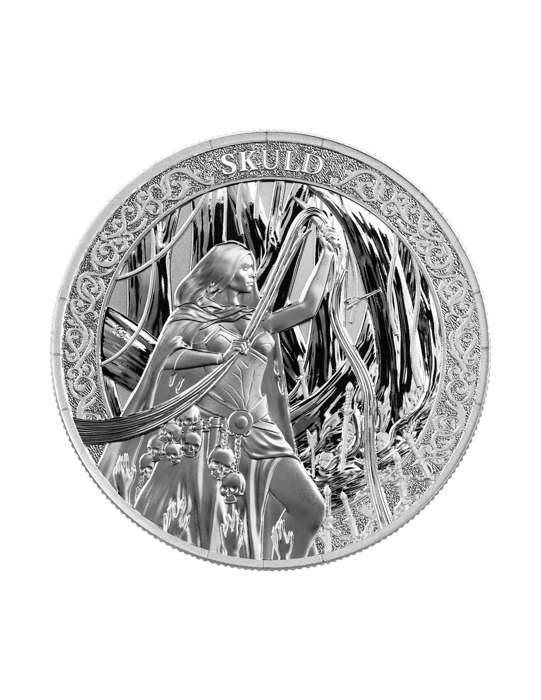Questa straordinaria moneta d'argento da 1 oncia è dedicata a Skuld, la Norn che governa il futuro e rappresenta ciò che deve ancora venire. Custode del destino e degli eventi invisibili, incarna il mistero, la responsabilità e l'impatto delle scelte presenti sul percorso di domani. La sua presenza simbolica ci ricorda che ogni decisione plasma risultati sconosciuti, fondendo l'inevitabilità con la speranza. Progettata da Kinga Sabatowicz, questa emissione Brilliant Uncirculated riflette sia l'eleganza artistica che la profondità mitologica.