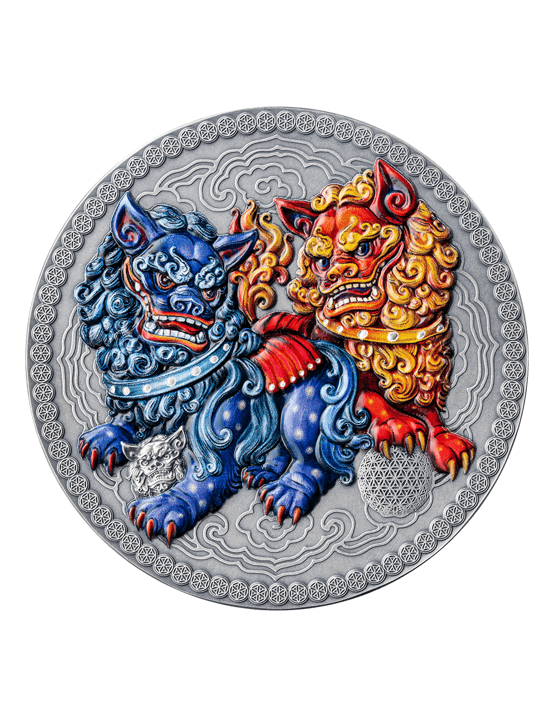 Questa straordinaria moneta d'argento da 2 once fa parte della Collezione Cultura Orientale ed è dedicata ai Leoni guardiani imperiali, sentinelle in piedi con energia di buon auspicio agli ingressi per portare fortuna e respingere la negatività. La moneta ha una qualità di finitura antica con rilievi colorati e viene fornita in un cofanetto a tema, insieme al suo certificato di autenticità.