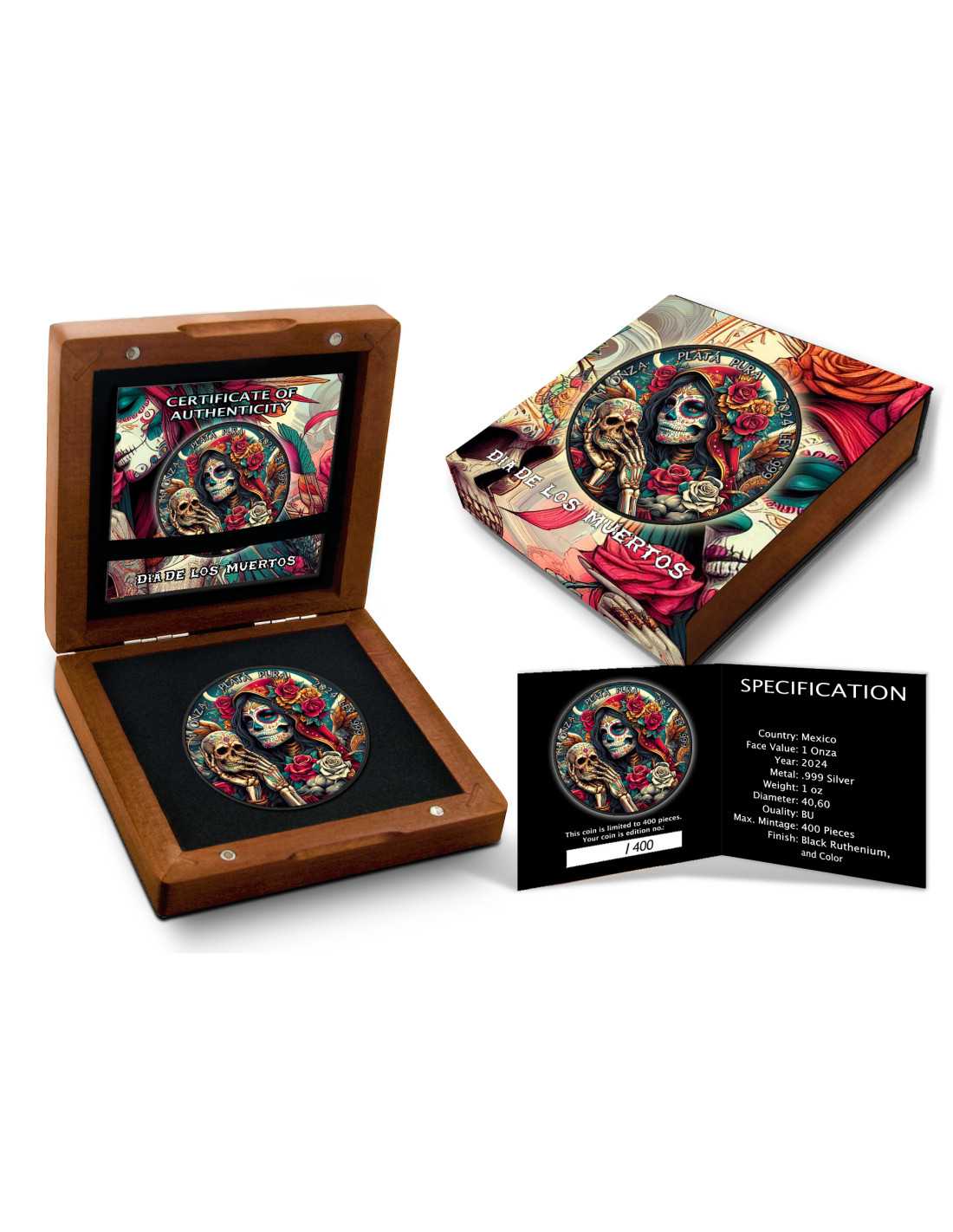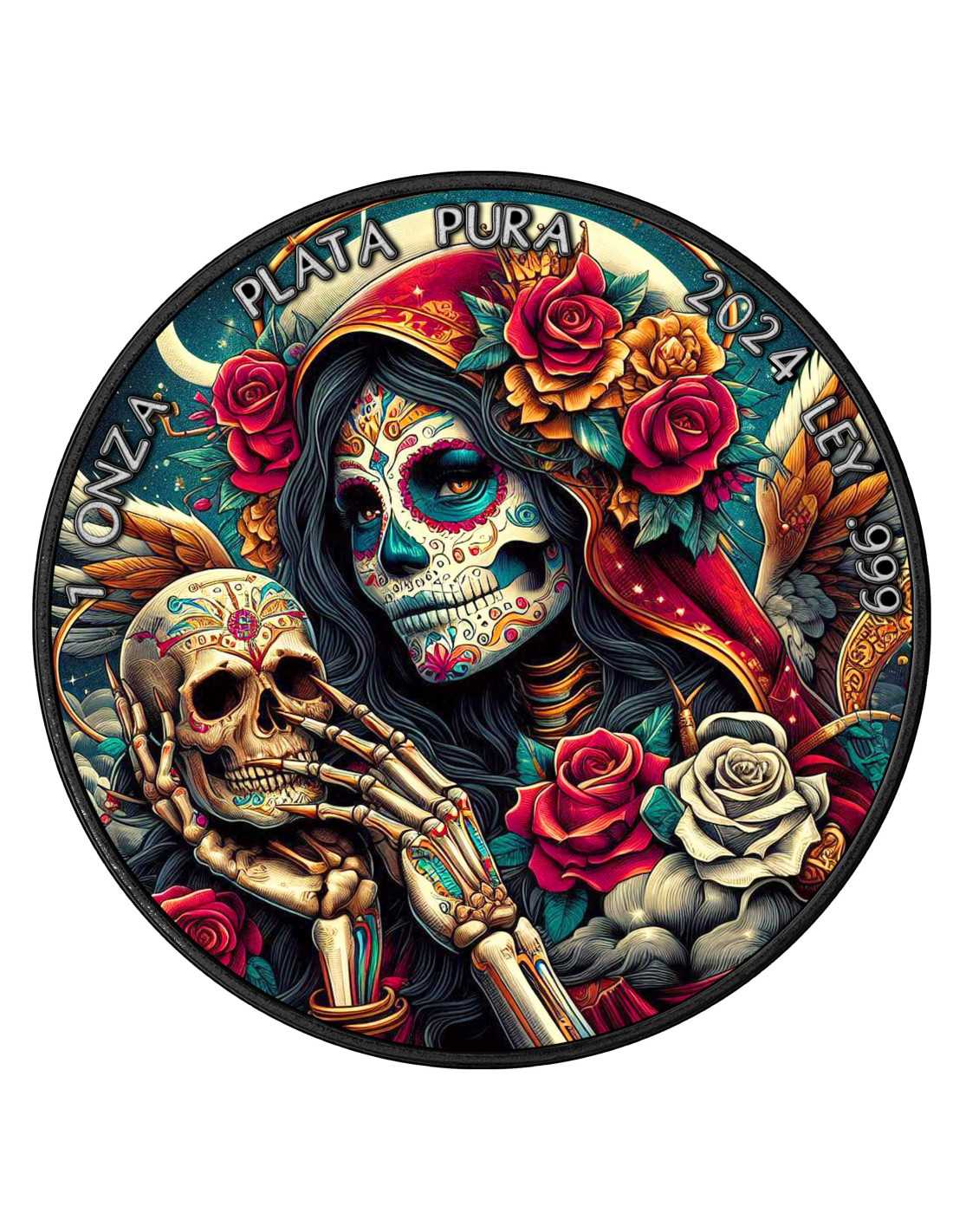 Questa incredibile moneta da 1 Oz è la sesta della famosa serie "Dia De Los Muertos", dedicata alla più famosa festività messicana: il "Giorno dei Morti" (Dia de los Muertos in spagnolo). Questa moneta è completamente placcata in rutenio nero con una splendida colorazione e viene fornita in un cofanetto, insieme al suo certificato di autenticità.