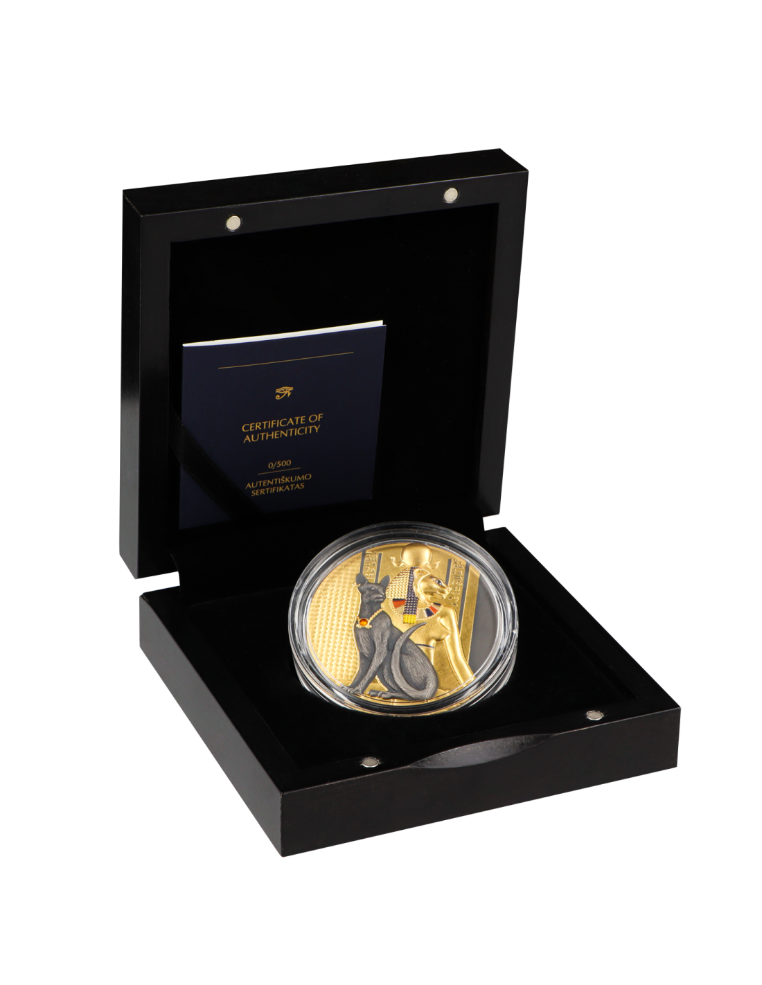This fantastic 2 Oz Silver coin is dedicated to the Lion-headed goddess : Sekhmet. The coin has an incredible High Relief, is partially Gold plated, has an Antique Finish quality with a swrovski crystal insert and comes in a case, along with its Certificate of Authenticity.