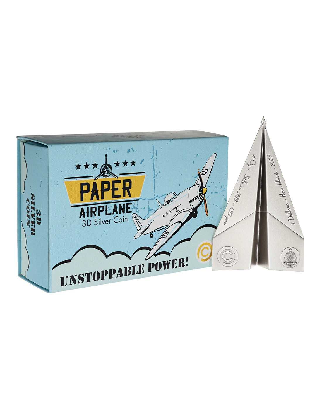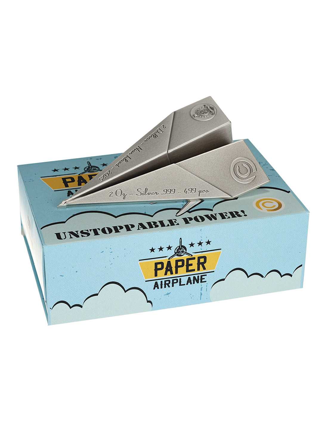 This impressive 2 Oz Silver coin is the first in the new "Folded Dreams" series and captures the spirit of childhood dreams and imagination with its airplane shape. The coin has a very nice shaped design with an antique finish quality and comes in a themed case, along with its Certificate of Authenticity.